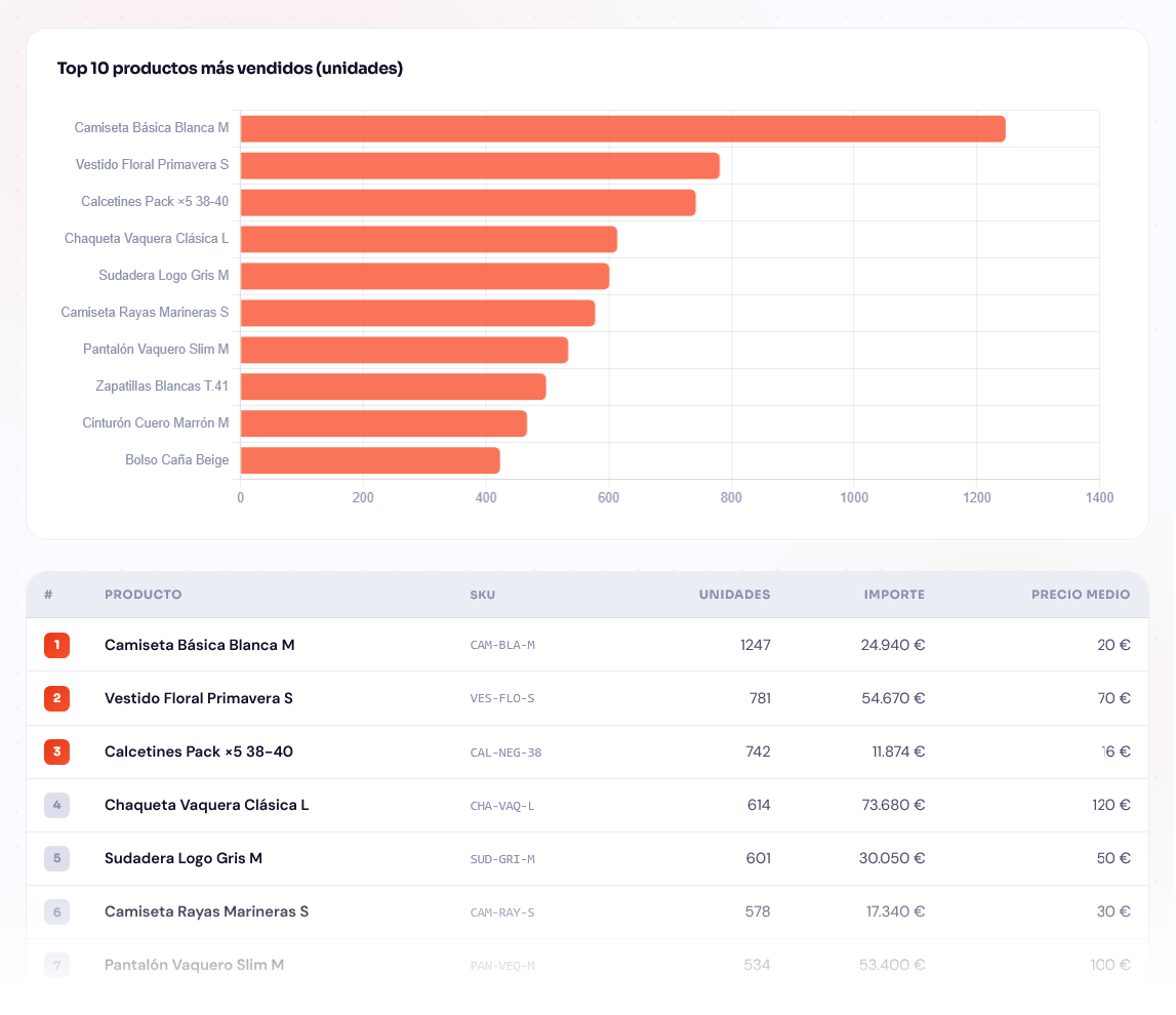 Ranking of best-selling products by units or by revenue, with variant breakdown for configurable products. Cross-filtered by EAV attribute to identify which SKUs drive sales within each category, collection, or season. Select any date range and compare with the previous period to detect demand shifts before they affect stock. Export the full list as CSV to feed your purchasing planning or prioritize marketing actions.