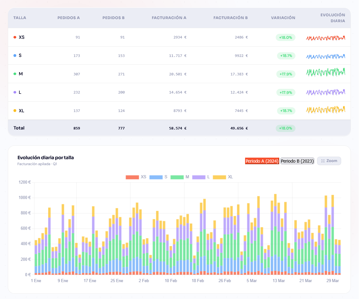 Compare two time periods: net sales, number of orders, and average order value, with percentage variation. Filter by date range, website or store, and group results by any EAV attribute in your catalog (collection, brand, season, color, format, size, flavor...). Includes daily trend charts to visualize patterns at a glance, and CSV export to share the analysis with your team or include it in external reports. Ideal for measuring the real impact of campaigns, detecting seasonality, and backing purchasing decisions with objective data.