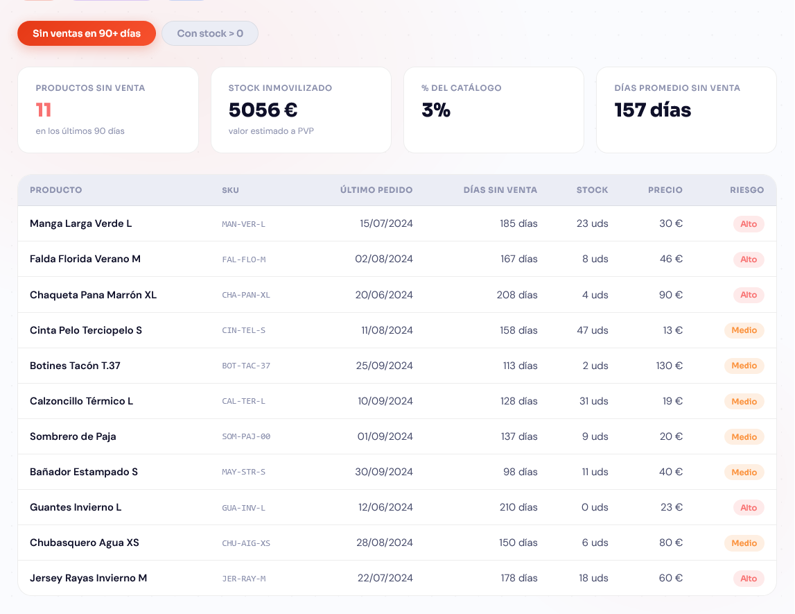 Detect active products that have generated no sales in the selected period. Identify locked-up stock, obsolete SKUs, and liquidation opportunities before the problem worsens and hurts inventory profitability. Filter by category, brand, or any EAV attribute to narrow the analysis to the product families you're most concerned about. An essential tool for keeping your catalog operational, clean, and aligned with real demand.